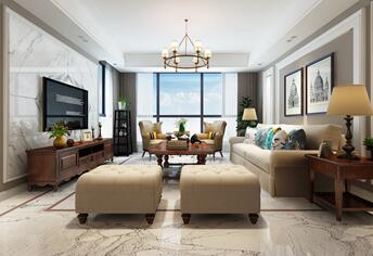 客廳:客廳電視背景墻采用白色護(hù)墻,搭配美式裝飾畫,選用美式家具,將空間層次搭配的條理有序,顯得大方得體.