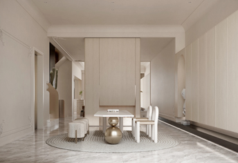 本案整體以沉穩(wěn)的淺灰色為基調(diào),象征著平日的踏實(shí)生活,而家具和飾品則以鮮明的對(duì)比色來比喻希望的活力,淡然樂觀的處世。客廳墻面以干凈明亮的白色為主,采用大面積的淺咖色護(hù)墻板,營(yíng)造舒適放松的家庭空間。衛(wèi)生間以清新精致的路線為主,大理石的裝扮,簡(jiǎn)約帶點(diǎn)輕奢。局部色彩的運(yùn)用呼應(yīng)了客廳家具的顏色搭配,而避免了設(shè)計(jì)元素的脫節(jié)。樓梯是銜接上下空間的橋梁,也是空間精美的造型藝術(shù)。無論是住宅空間還是商業(yè)空間,樓梯不再只是同行要道,還是空間中的一道風(fēng)景。