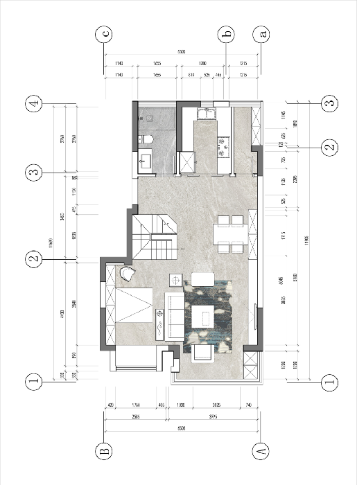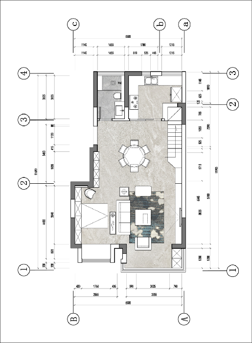 一樓樓梯位置不變,挑空區域做了現澆,把衛生間設置在挑空區域。增加廚房和衛生間的體量。大橫廳和陽臺打通,面積進一步擴大,分成了客廳和多功能區域。