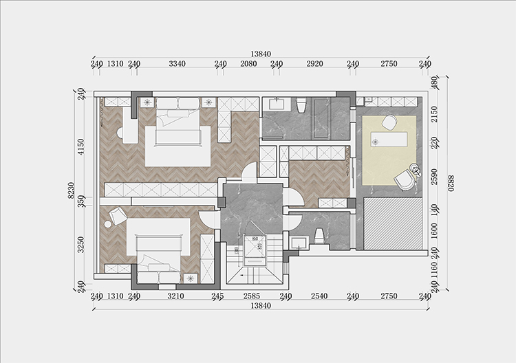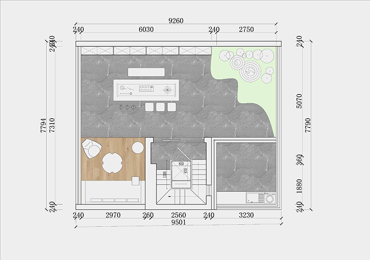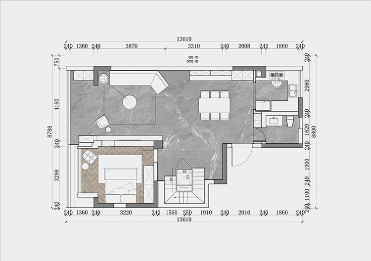 一樓后期方案里的樓梯也很有意思,把一部分空間給到了衛生間,這樣會大一點,設置了一個老人房。