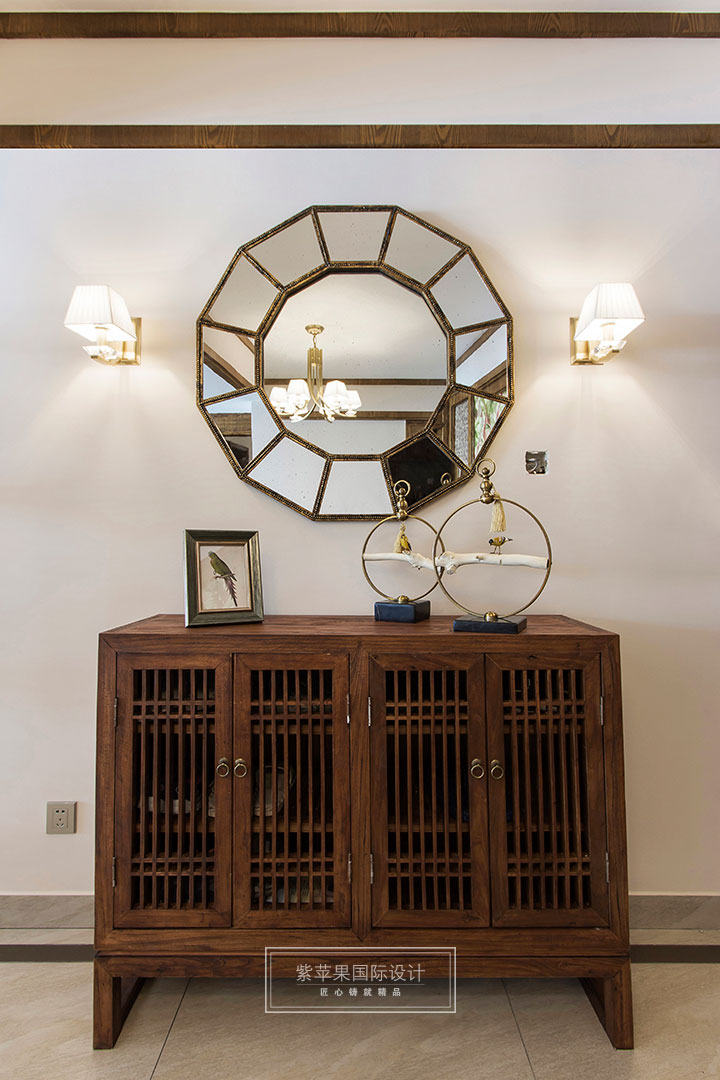 因本案業主是作為度假需求使用,所以玄關處并未做復雜設計,而是從美觀角度出發僅作簡單陳設,棕色系鞋柜和精致的裝飾品風格獨特而別致,雖是簡單陳設卻不感隨意潦草,讓到訪者一入門就深感業主對生活品質的不凡追求。